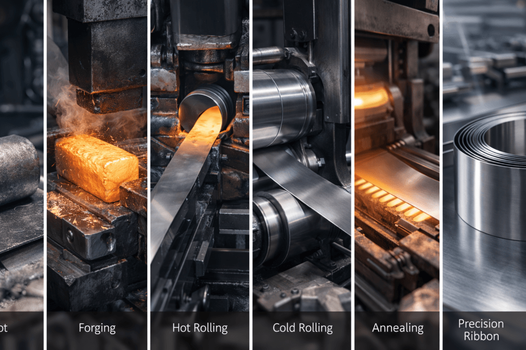 Through a series of hot and cold rolling operations, the metal is gradually reduced into thin strips or ribbons.
